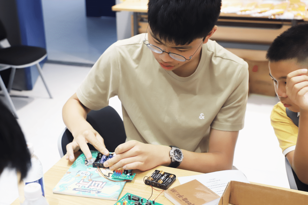 随后,同学们迎来了 “玩转知识” 挑战课堂,动手操作百变积木电路器具,亲手组装串联与并联电路,成功实现了点亮路灯、鸣响喇叭、转动飞轮等多种趣味功能。