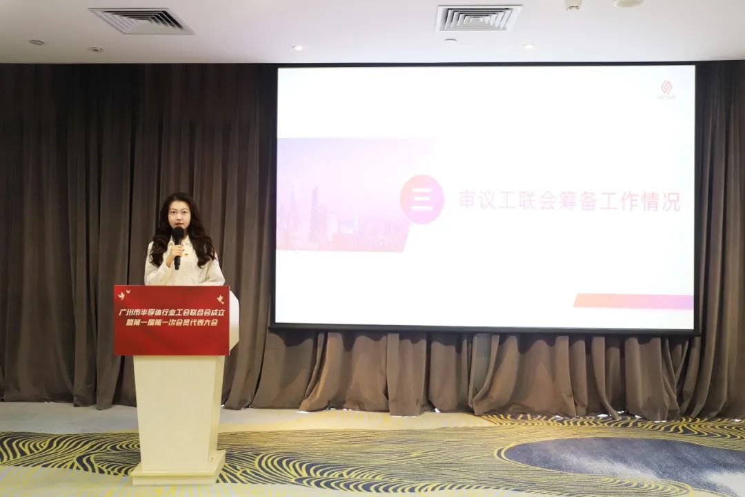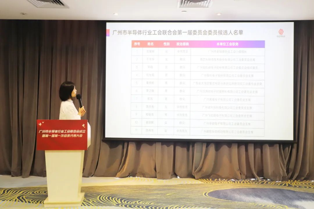 潘雪花秘书长宣读广州市半导体行业工会联合会第一届委员会委员候选人名单。