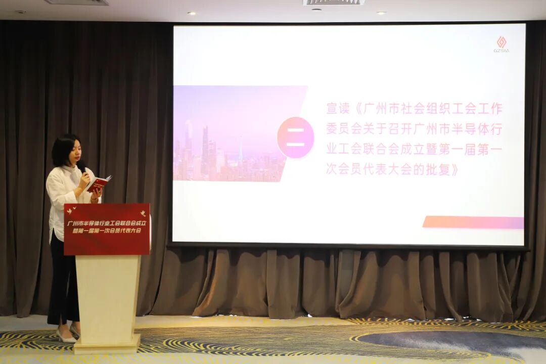 潘雪花秘书长宣读《广州市社会组织工会工作委员会关于召开广州市半导体行业工会联合会成立暨第一届第一次会员代表大会的批复》。