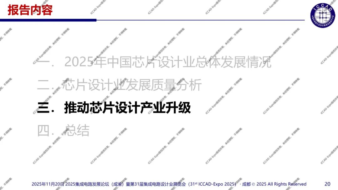 11月20日,“2025集成电路发展论坛(成渝)暨三十一届集成电路设计业展览会”(ICCAD-Expo 2025)在成都西博城正式拉开帷幕。中国半导体行业协会集成电路设计分会理事长魏少军教授为大会作了题为《技术创新驱动设计产业升级》的主旨报告,以下为报告全文介绍。(报告版权为ICCAD-Expo所有,未经授权,不得转载)